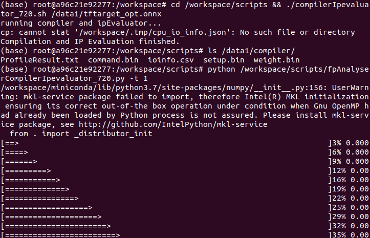 此步驟是為了測試模型結構是否可以被ToolChain採用並估計性能,所以如果出現 "cp: cannot stat '/workspace/.tmp/cpu_io_info.json': No such file or directory " 是不並會影響後續的指令產生nef檔,因您使用的platform為720,所以您在此步驟成功執行的結果會在 /data1/compiler/ 下產生 ProfileResult.txt。