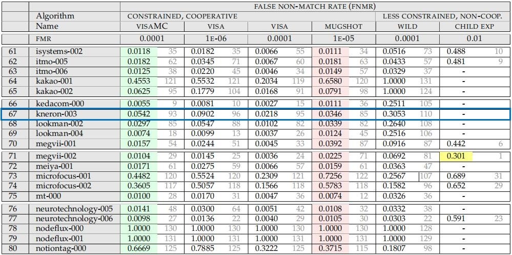 7月5日,美国国家标准与技术研究院(NIST)公布了全球权威人脸识别比赛FRVT(Face Recognition Vendor Test,中文称为人脸识别供应商测试)的最新报告,在131个参赛模型中,有6个模型小于64MB,达到业界公认的轻量级。其中,耐能Kneron-003模型的VISAMC、VISA、Mugshot、Wild、Child EXP等多项测试跑分均位居第一,在Mugshot测试中甚至高于国内某AI独角兽的1.3GB模型,成为全球轻量级人脸识别算法的领跑者。